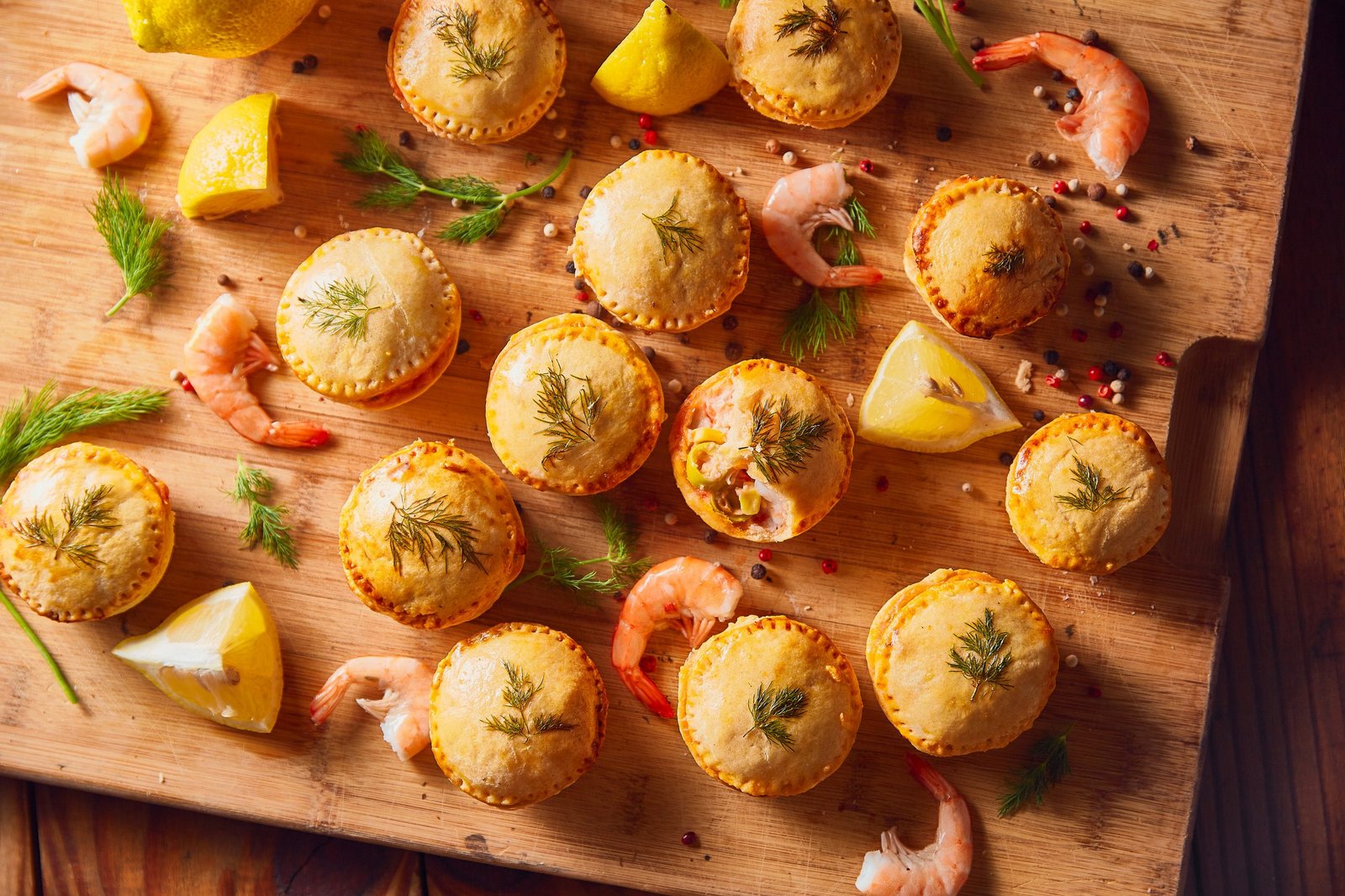 Faça pequenas porções com a massa e vá abrindo círculos finos com o diâmetro das fôrmas de empadinha. Forre-as e distribua o recheio. Faça agora pequenos círculos com a massa e cubra o recheio. Pincele com um ovo batido. Decore com ramos de dill e leve ao forno pré-aquecido em 180C até que estejam douradas e assadas.