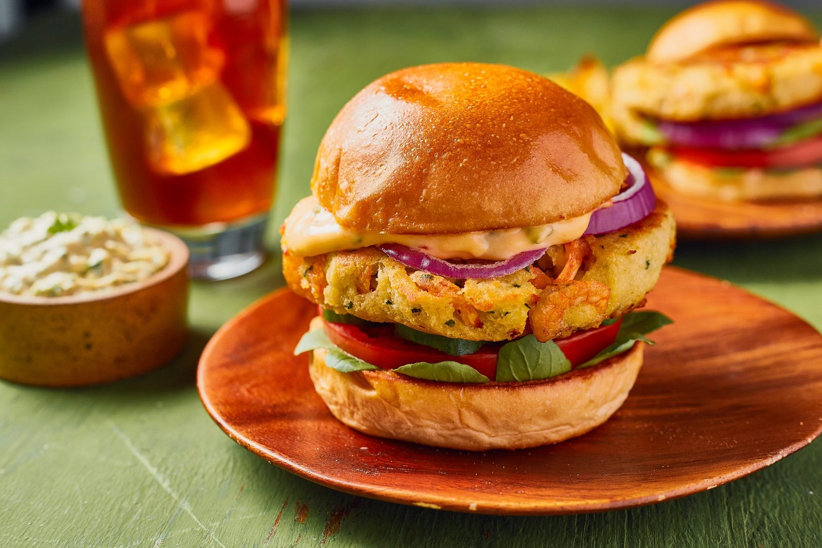 - Monte os hambúrgueres com pão, rúcula, tomate, fatias de avocado, o hambúrguer de camarão, cebola roxa e o molho de maionese.