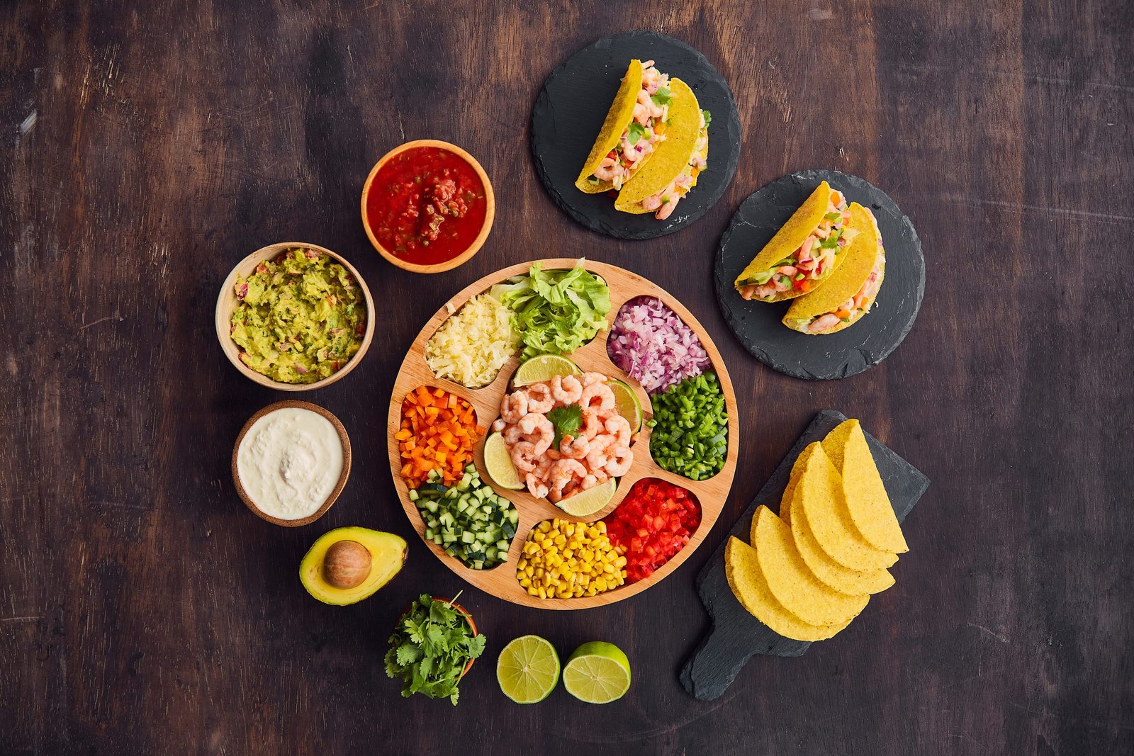 - Monte os tacos na hora com os ingredientes picadinhos, os camarões DellMare, creme azedo, guacamole e salsa picante.